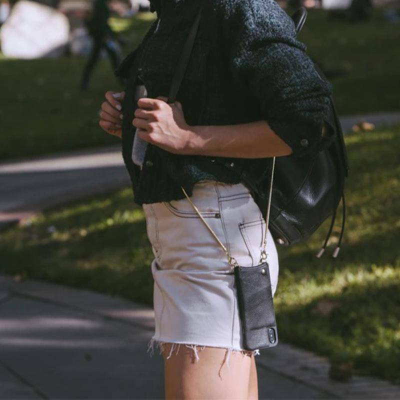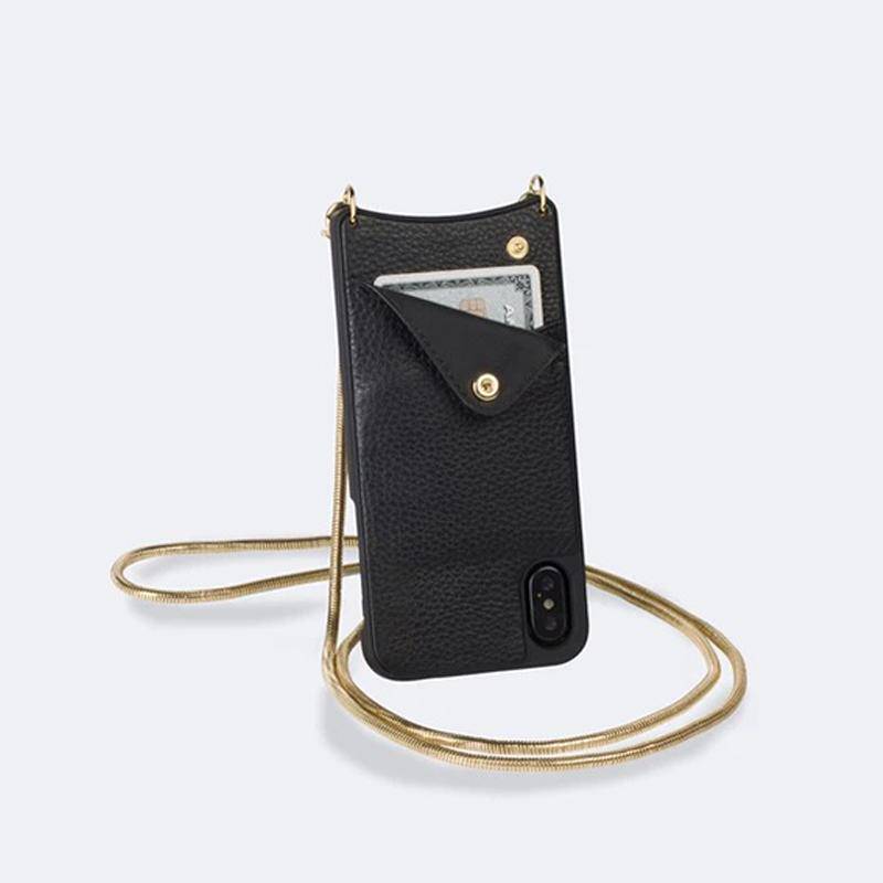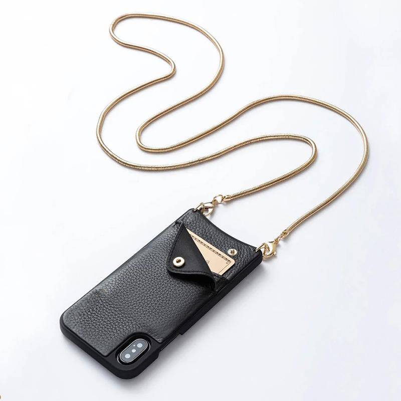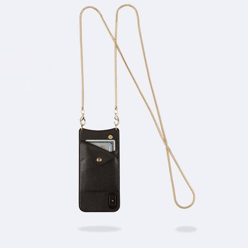 Le Crossbody présente un étui en cuir noir classique et des détails dorés, c'est un favori parmi les stylistes et l'un des étuis à bandoulière originaux. Sa simple bandoulière en chaîne serpent et son compartiment caché pour carte de crédit snapback en font un incontournable pour toute activité en déplacement ou style de vie haute couture.
