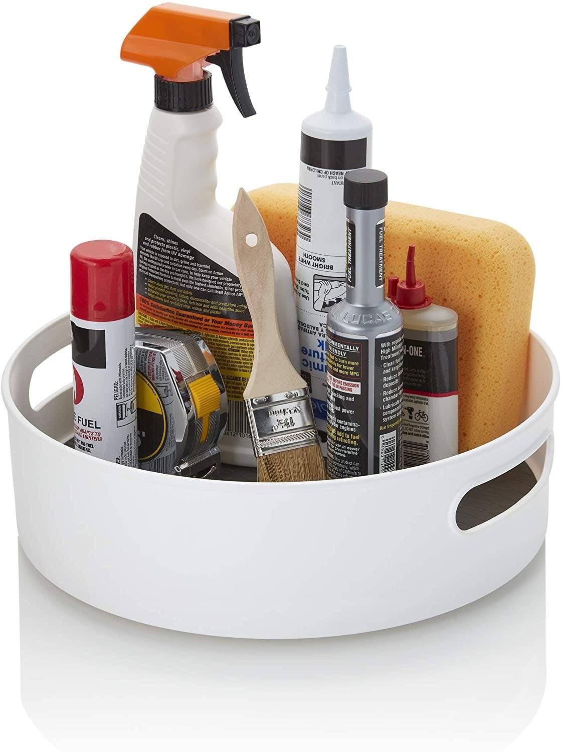 The 10-inch Storage Turntable is a perfect storage solution for your home. Perfect for containing and organizing loose items and keeping cabinets neat and tidy. This smooth-glide, revolving organizer provides easy access to everything you need, and features handles for easy transport. Its nonskid base secures the turntable in place while rotating, and its raised, 2.6-inch rim prevents items from falling off when in use. Measures 10 inches in diameter. To clean, wipe with a damp cloth.