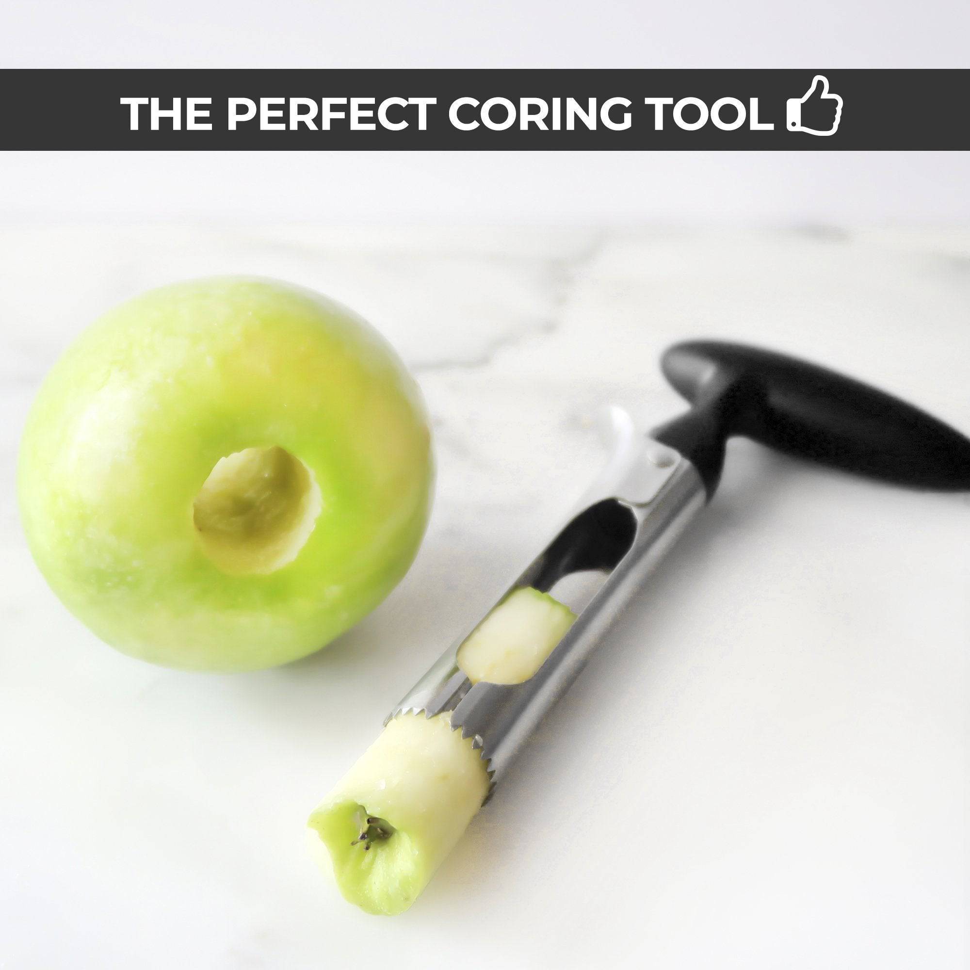 Whether you are cooking, baking, blending, peeling or juicing, use this amazing coreer tool on apples, pears, pineapples, tomatoes, cucumber, onions, bell peppers, zucchini, fuji, honeycrisp, gala, red delicious, pink lady apples and more, to remove unwanted cores and seeds. Unlike a knife, applepeeler, cutter, peeler machine or dicer, this tool is effective in preserving the parts of the fruit you most enjoy. Simply punch and twist to get every seed. Simple peel, core and slice any apple for apple pie.